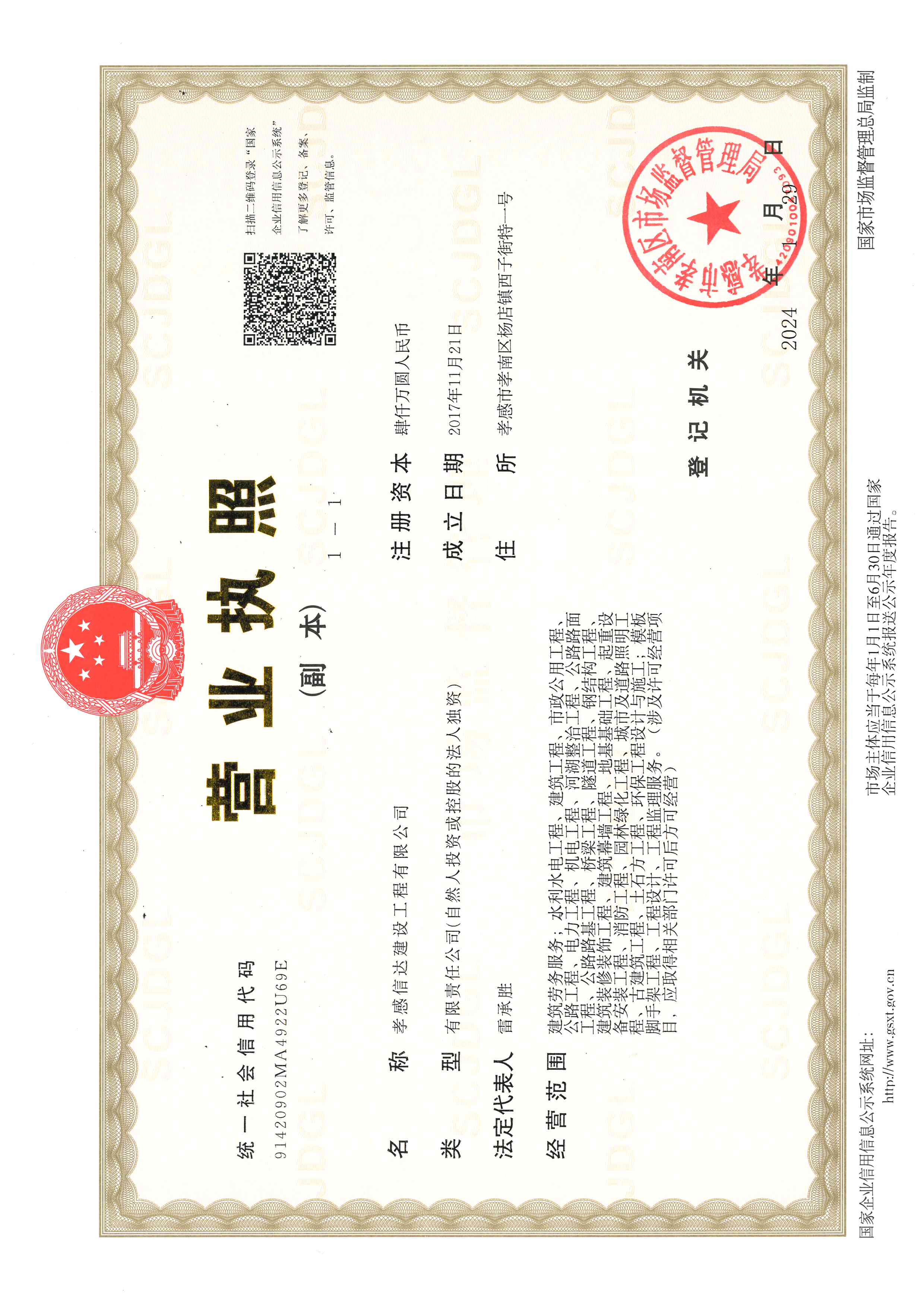 孝感信達(dá)建設(shè)工程有限公司成立于2017年11月21日,地址:孝感市孝南區(qū)楊店鎮(zhèn)西子街特一號,注冊資金4000萬元,有限責(zé)任公司(自然人投資或控股)。